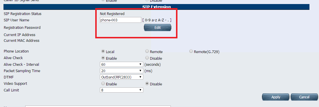 - Registration Password : Password dùng để đăng ký IP Phone, bên trái lựa chọn Edit chưa hiển thị dấu **** có nghĩa là máy nhánh SIP 103 chưa tạo ra password nên không thể đăng ký vào IP Phone được.
