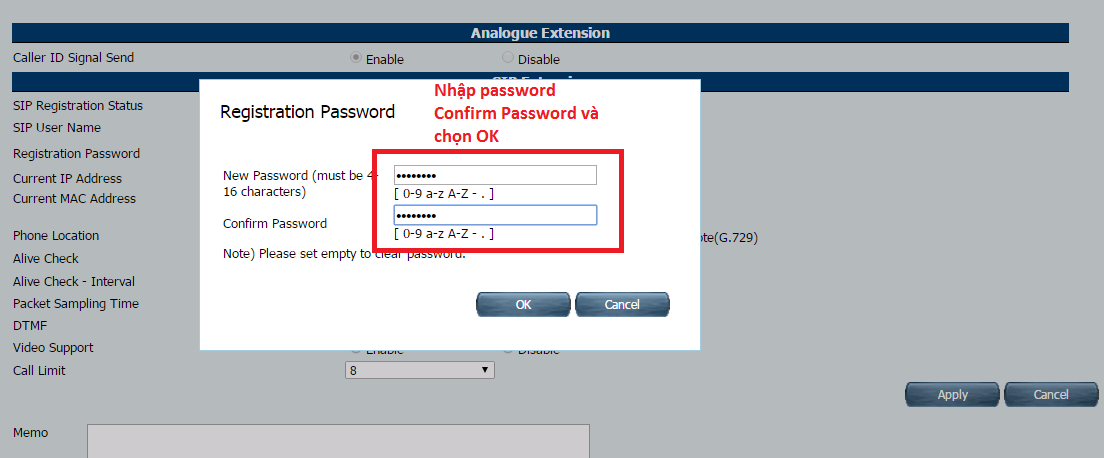 Khi đã tạo Password xong bấm OK sẽ thấy có “****” 4 dấu sao cạnh bên nút Edit, như vậy là máy nhánh SIP đã có Password sẵn sàng đăng ký vào IP Phone. Chọn Apply để hoàn tất