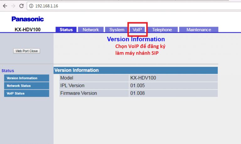 Đầu tiên truy cập vào địa chỉ IP của HDV 100 (máy nhánh) trên giao diện WEB: