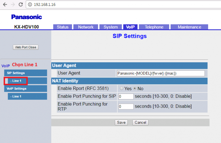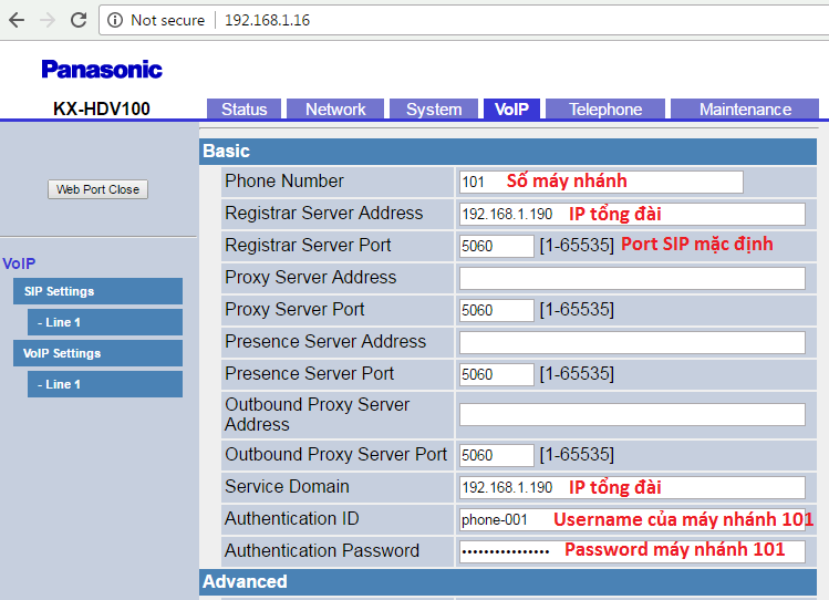Đăng ký điện thoại IP Panasonic HDV 100 vào tổng đài HTS 824