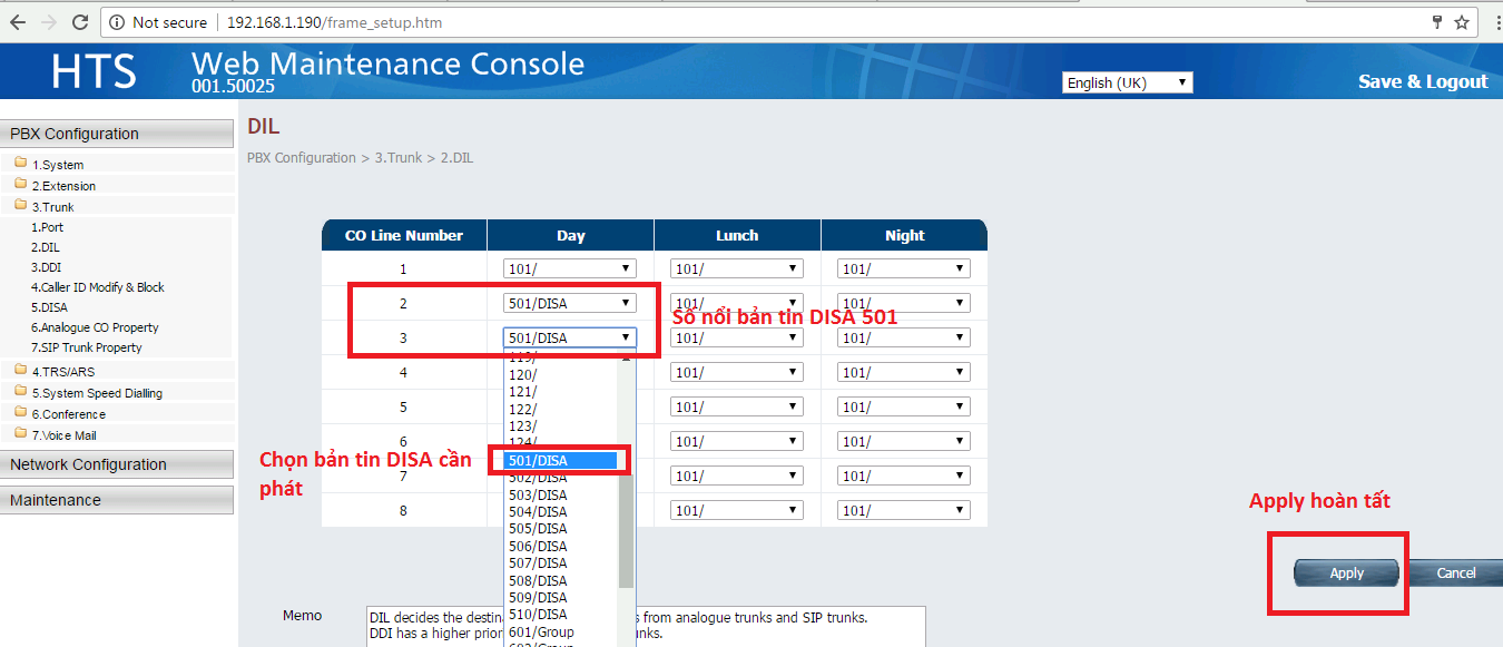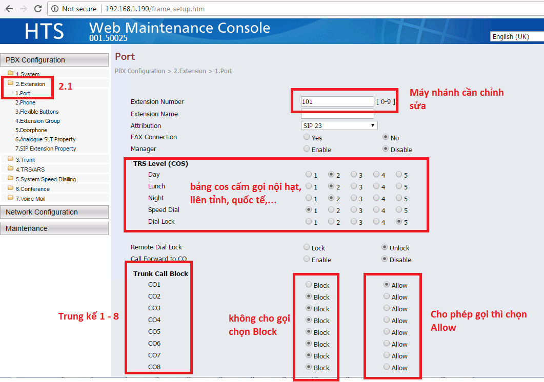 Lưu ý: Tắt hết tất cả trung kế không dùng.