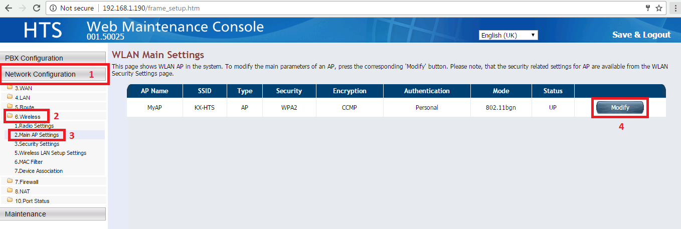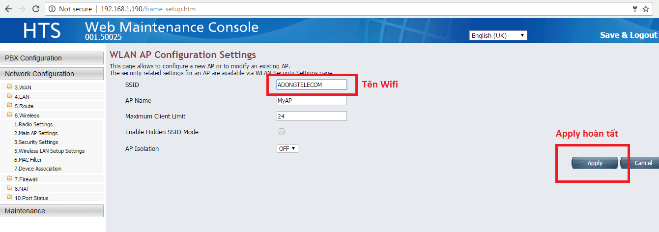 Vào phần Network Configuration => Wireless => Main AP settings => Modify
