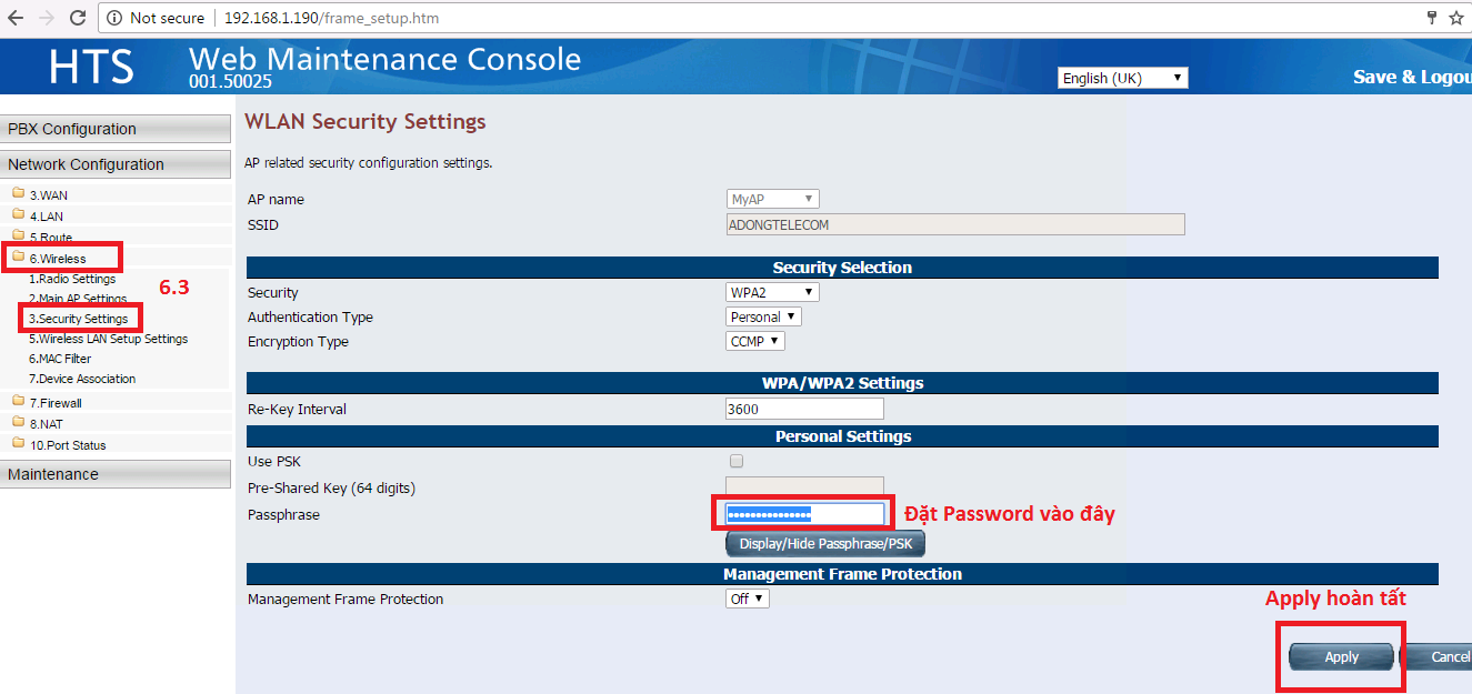 Để thay đổi Password wifi HTS 824 làm như hình sau: