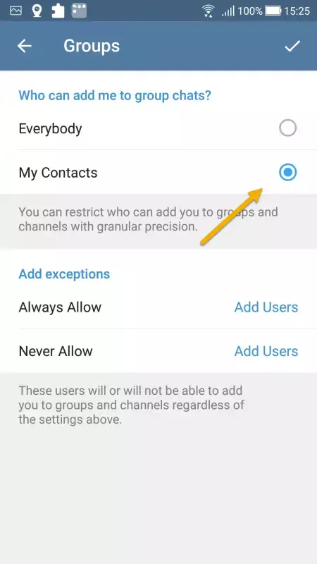 Có một số cách để bạn có thể ngăn mọi người thêm bạn vào nhóm Telegram. Đầu tiên là chỉ cho phép người quen trong danh bạ vào các nhóm và cách còn lại là chặn đối tượng cụ thể trong danh bạ.