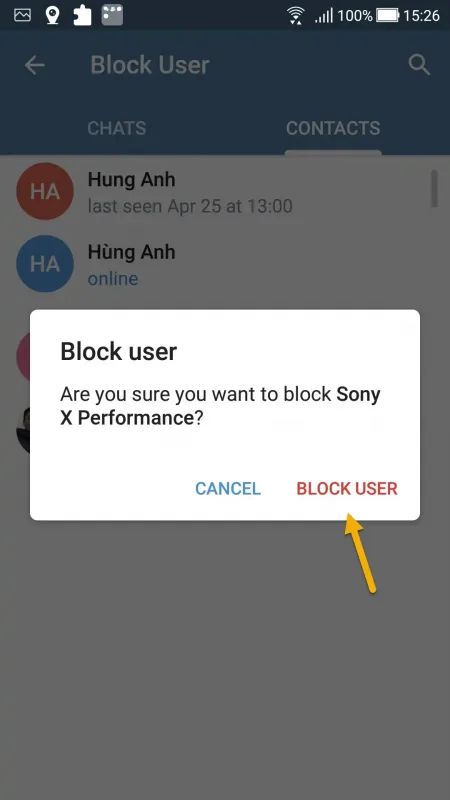 – Trong giao diện hiện ra, bạn mở thẻ Contacts > bấm vào đối tượng muốn chặn > bấm Block user.