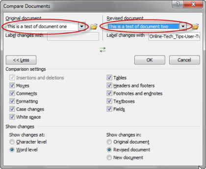 Khi chọn xong tên của hai tài liệu sẽ hiện ra trong hộp. Nút mũi tên hai chiều dùng để đổi vai trò của tài liệu gốc và tài liệu sửa đổi. Bạn có thể tick hoặc bỏ tick để thiết lập các tuỳ chọn so sánh nhưng tốt hơn nên để mặc định. Nhấn OK để được kết quả: