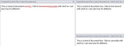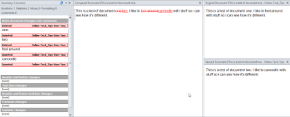 Ta sẽ tìm hiểu chức năng của từng cửa sổ. Bên trái là cửa sổ Summary tóm tắt những thay đổi giữa hai tài liệu. Tiếp theo, cửa sổ ở chính giữa màn hình hiển thị tài liệu chứa cả những thông tin gốc lẫn chỉnh sửa. Cuối cùng, bên phải là 2 cửa sổ hiển thị bản sao của tài liệu gốc và tài liệu đã sửa đổi.